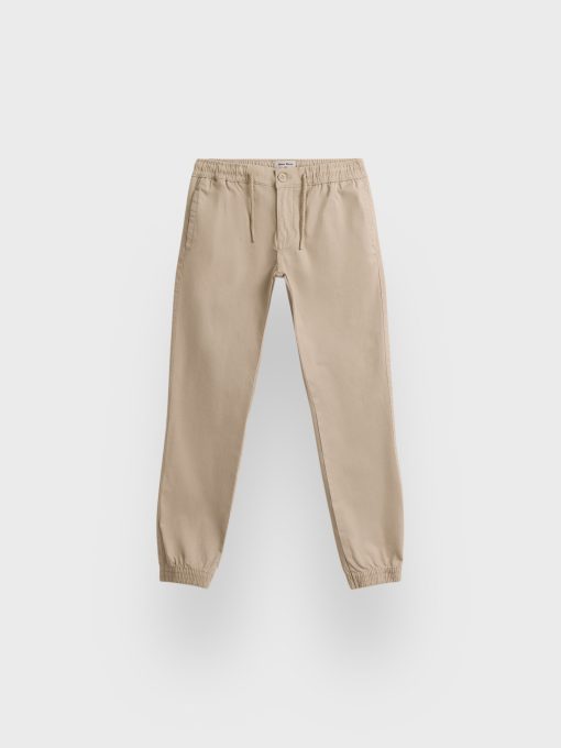 Pantalón con cinturilla elástica ajustable por cordones al tono y bajo con terminación de puño elástico. Cierre central mediante botón y cremallera, dos bolsillos en la parte delantera y dos en la parte trasera con detalle personalizado sobre uno de ellos.