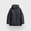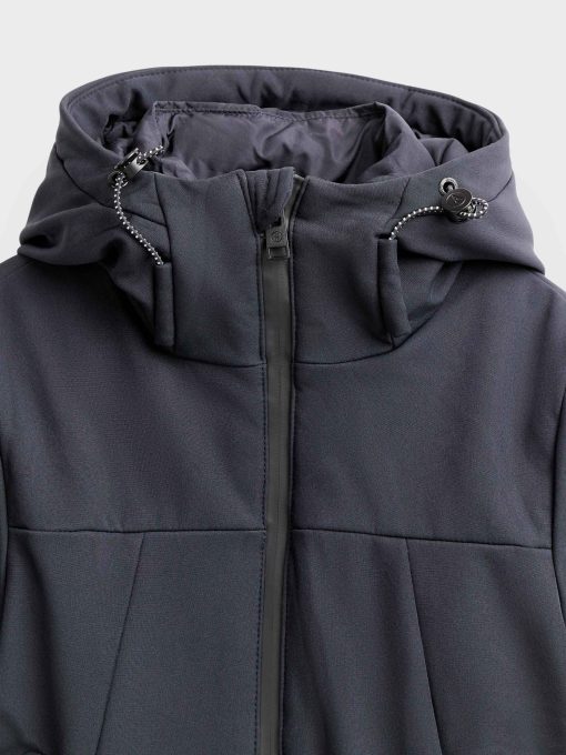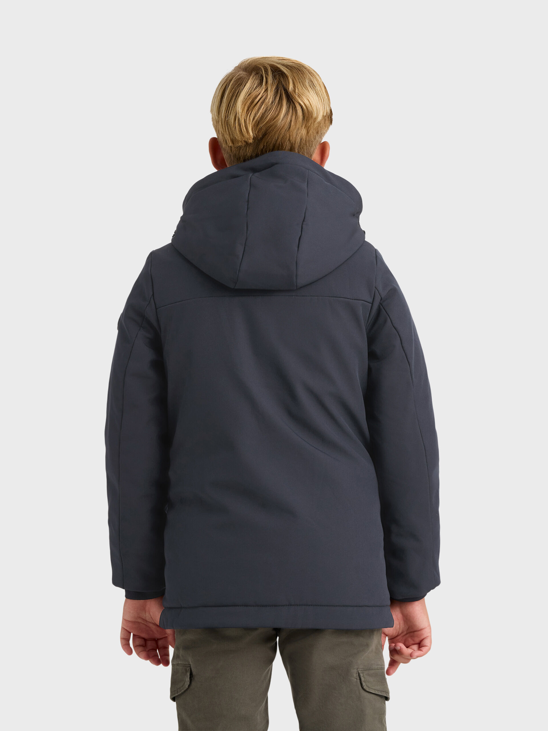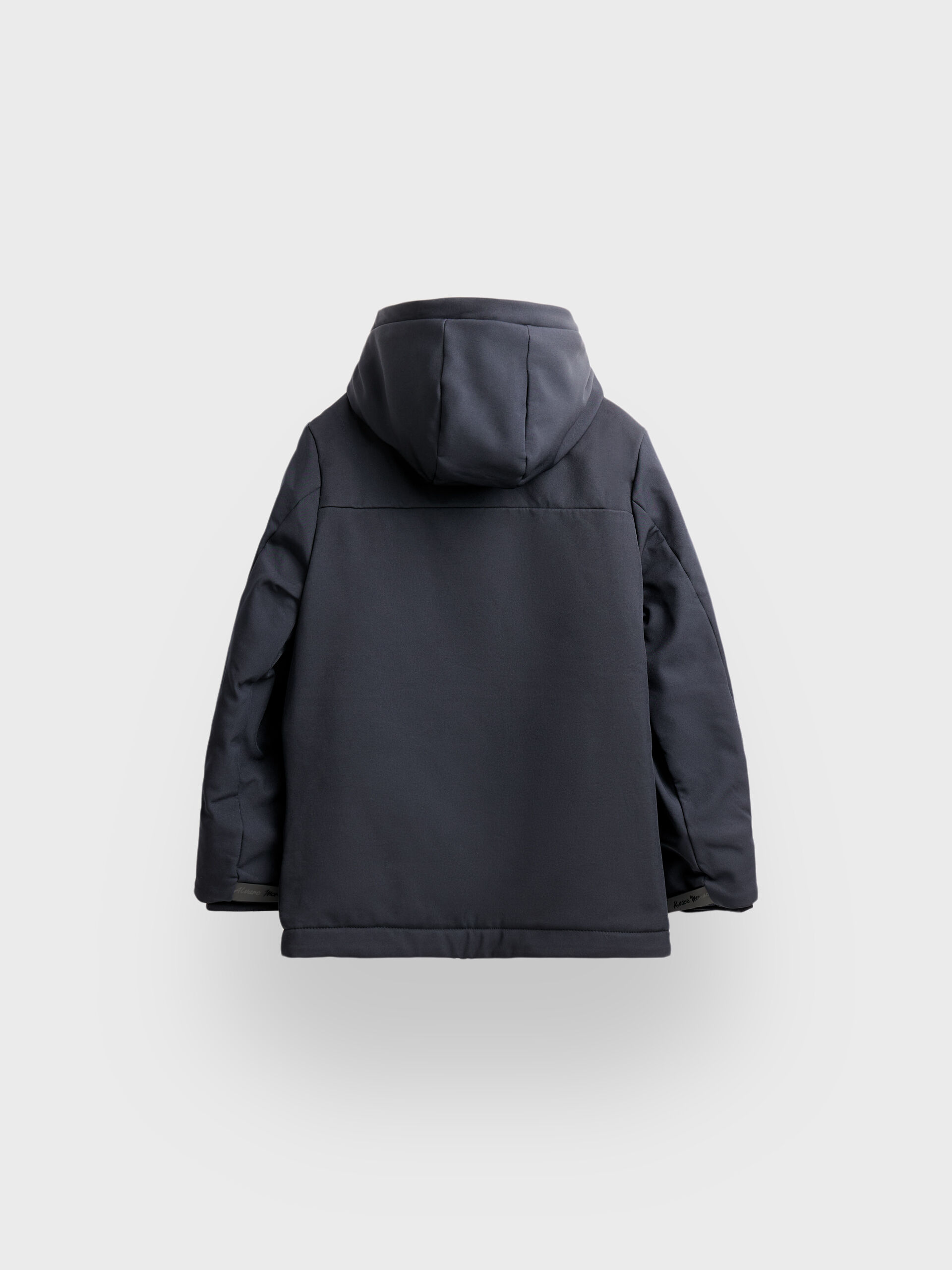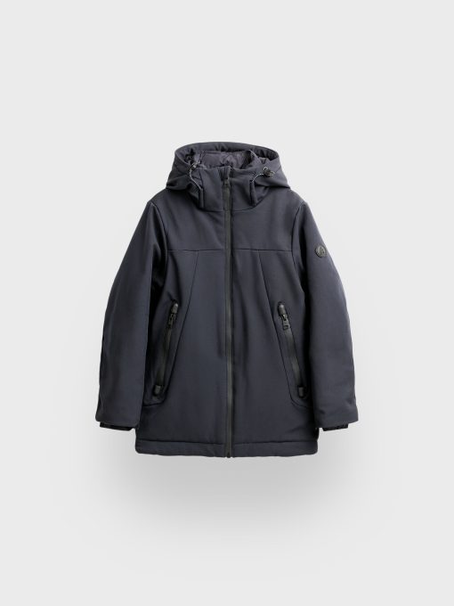 Parka acolchada con cuello subido y gorro ajustable. Cierre central mediante doble cremallera, dos bolsillos amplios en la cintura y manga larga con puños ajustables. Parche engomado en una de las mangas. Bolsillos en su interior. Cremalleras termoselladas.