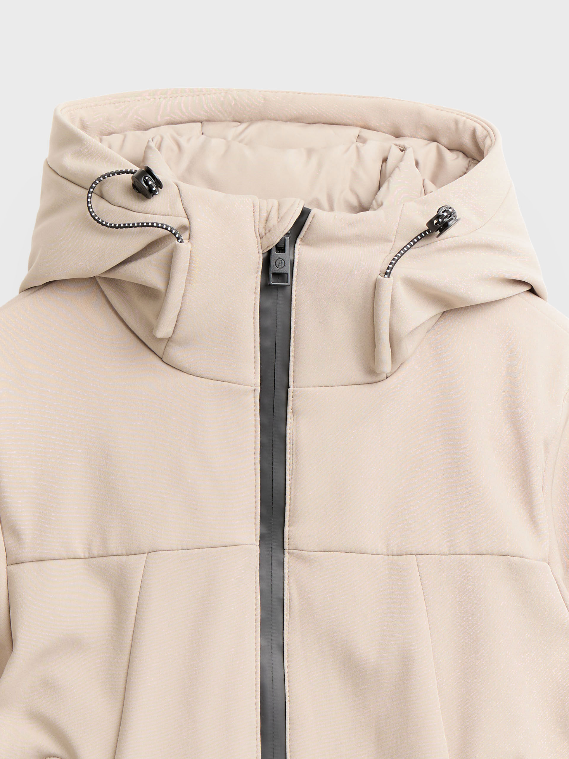 Parka acolchada con cuello subido y gorro ajustable. Cierre central mediante doble cremallera, dos bolsillos amplios en la cintura y manga larga con puños ajustables. Parche engomado en una de las mangas. Bolsillos en su interior. Cremalleras termoselladas.